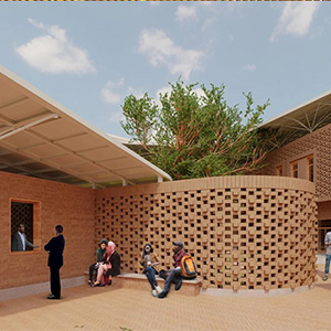 A la vez, crea espacio para las numerosas actividades que se ofrecen, desde exposiciones y cursos de idiomas hasta conciertos y reuniones informales. Esto se consigue con un edificio compacto de dos plantas, diseñado para emular la silueta de la copa de los árboles que han ocupado el terreno durante mucho tiempo. La propia estructura actúa como un escudo que protege a los ocupantes de cualquier ruido potencial y a sus propios visitantes del ruido del tráfico. Una segunda piel traslúcida, hecha con los mismos ladrillos BTC de origen local que los muros estructurales, garantiza una apariencia ligera.